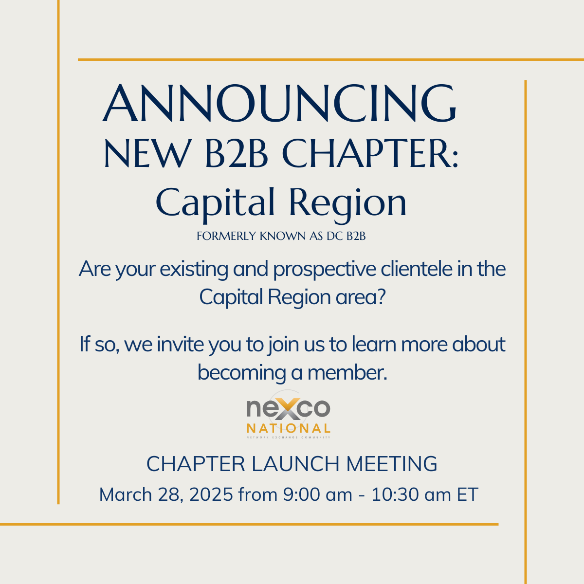 Exciting news! The DC B2B Chapter is evolving to become the Capital Region B2B Chapter—expanding our reach to better serve professionals across the entire Capital Region.