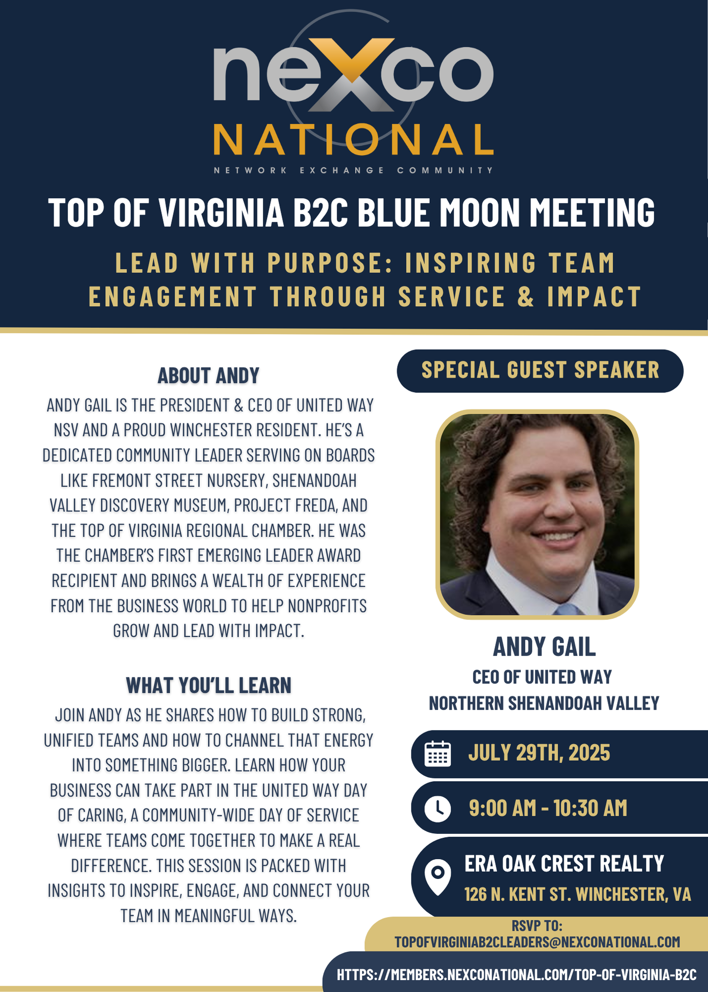 Special Guest Speaker: Andy Gail – CEO, United Way of Northern Shenandoah Valley Topic: Lead with Purpose: Inspiring Engagement Through Service and Impact Andy will share how to build strong, unified teams and how to channel that energy into something bigger. Learn how your business can take part in the United Way Day of Caring, […]