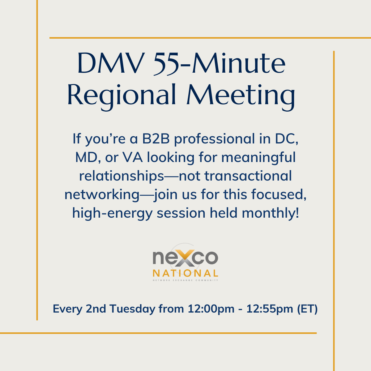 If you’re a B2B professional in DC, MD, or VA looking for meaningful relationships—not transactional networking—join us for the neXco DMV Regional 55-Minute Meeting.